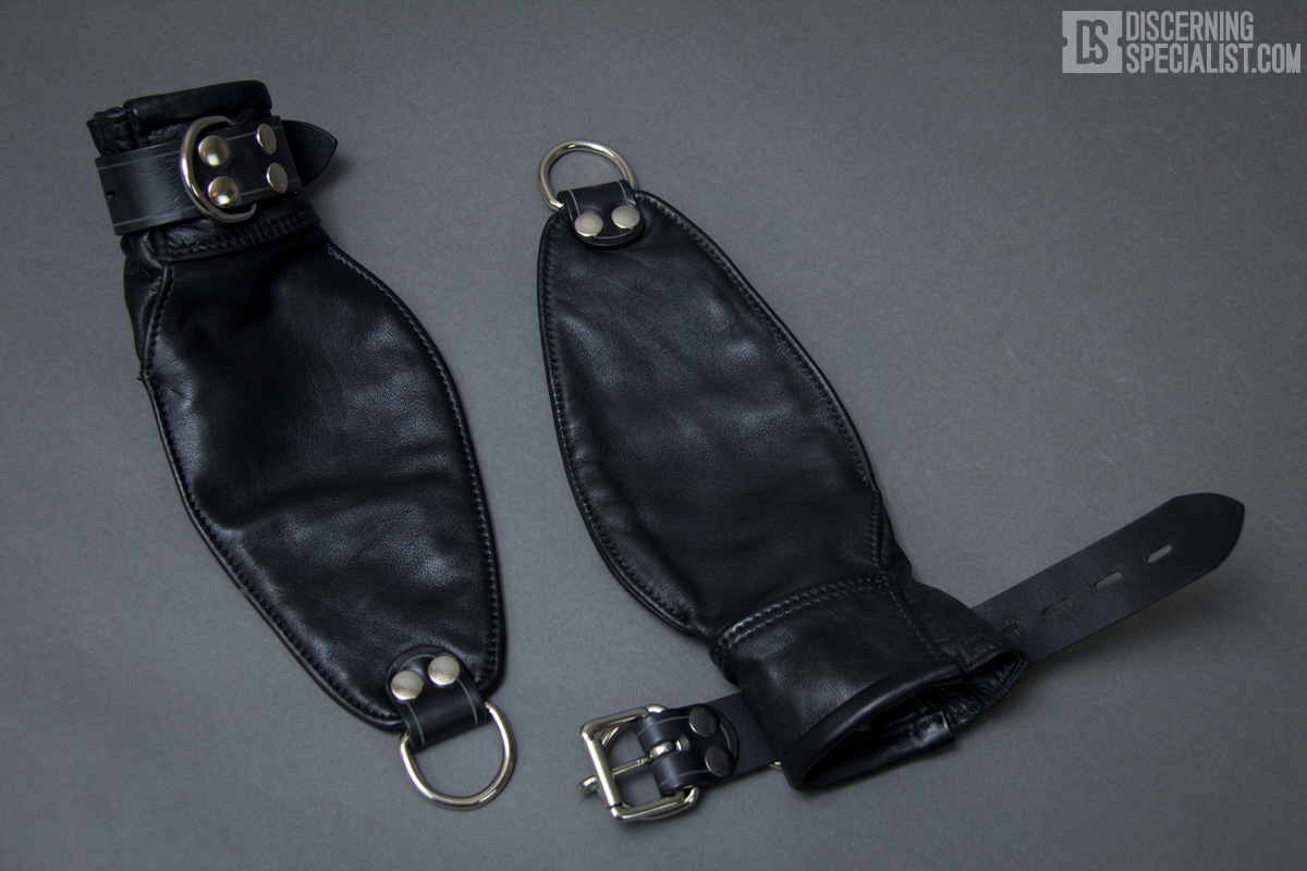 As usual the build quality on these is excellent from Top To Bottom Leathers. The majority of the leather is nice and soft while using appropriate thickness straps and quality hardware. If leather is your thing, it is hard to not just want to pet these things. A custom female size was ordered and they do fit, but they ended up a bit on the tighter side this time. Although the intended wearers can put them on, after some play where a little sweat is common they can be a bit difficult to remove. Additionally my hand is not far off from a female size, however they are difficult for me to put on at all. Although they do fit the size ordered / requested, if I were to do it again maybe I would ask for a small male size to offer a little more wearer flexibility.