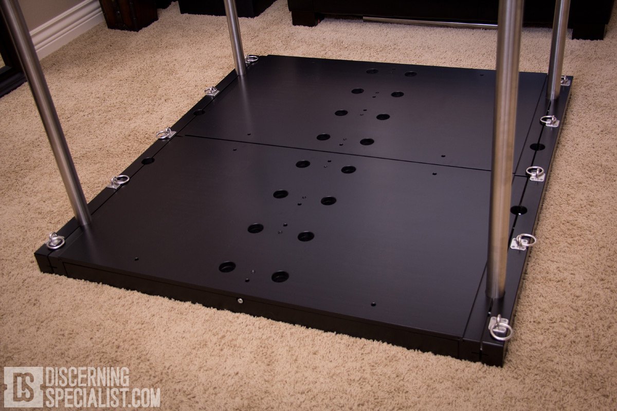 The base Cube platform consists of 2 main pieces with 2 long side parts that connect it all together and tighten down the side pole slots, where 4 slots are offered on each connected side. Appox dimensions: L 128cm x W 119cm x H 7cm(no pads) 11cm(with pads). There are dual pole slots down the middle as well (8 positions x 2) That are tightened by a screw on the other sides (I'll just refer to as front and back) of the main platform. The sides tighten up in a fairly direct fashion with hex screws and washers while the center channel is a little more unique where a central lower base plate is moved as the adjustment screw is tightened, causing tension on all the center pole slots.
