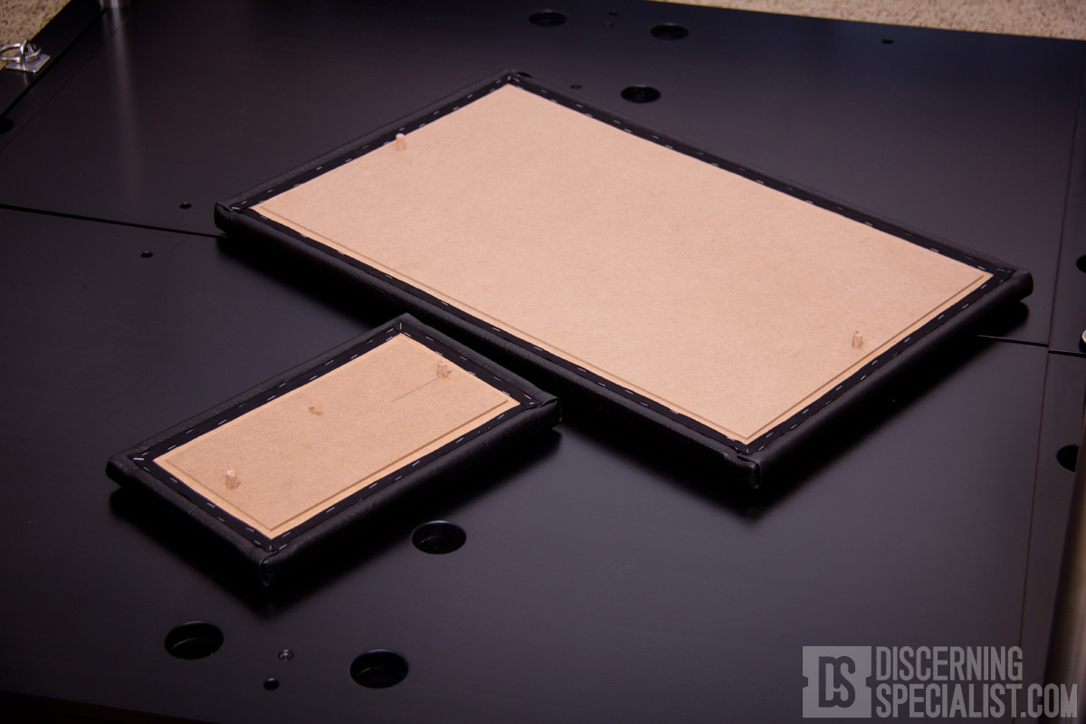 Modular Pads are a package option with 4 big panels for the sides and 4 smaller pads down the middle. They plop in with IKEA like dowels on the back of each panel which stay in place better than expected. The padding helps any sort of kneeling positions greatly so not causing unintended pain. Having them modular is not only a necessity to access the center pole slots, but a nice option where they can be removed if worried about damaging them with something like sexy high heels. Offhand I got the pads in "SkyLeather", their leather synthetic as they cost less and likely will be more durable, but they do offer genuine leather versions as well.