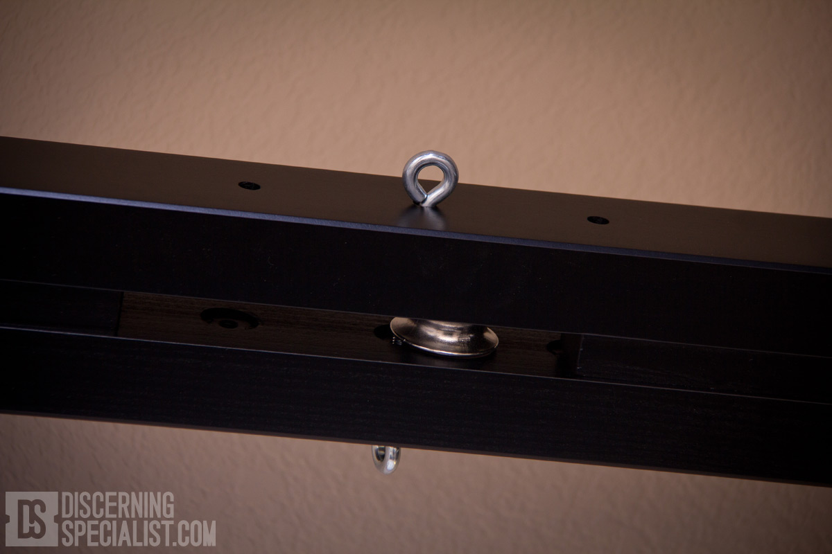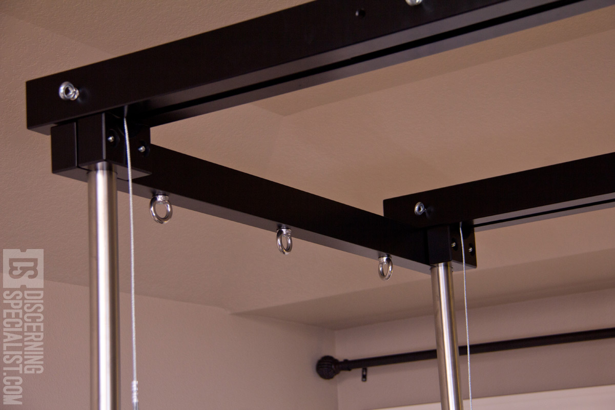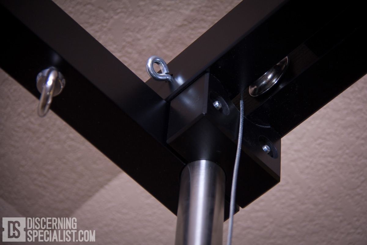 As a plus the front/back pulley top bars have screw slots to allow installing of included eyebolts. The are 3 positions on both interior and exterior sides to really expand the tie down point options. I found adding my own washers to these eyebolts allowed a little better control of the screw down "timing" to get the rotation where I wanted it while being in snug. The top bars on the cube sides are more simplistic, but do have 3 large tie down rings each. They don't spin and suffer from the timing issue so I wish they ended up all facing the same way. Currently it is a bit of a visual con, however not a deal breaker. If I get motivated I may try adding some gaskets to see if I can get the snug rotations more even. Extra parts are included to allow the pulley top bars to be used on their own (mounted to just 2 tubes) so one can set them up in a different position or just have a more minimal setup. Although nice that is a possibility, I must say I do like the stability of having the default 4 main corners cube setup now that I have all the main parts I'm interested in. Before I forget, one gets to pick the length of the main long tubes to make sure it fits in the desired space. One will generally want them as high as possible, but will want to be around 15cm shorter than the ceiling height so one can assemble the cube without issues. The main consideration is having enough clearance to be able to get the Top Bars onto the tubes. If in a height issue jam, one might be able to go taller with the tubes if prepared to put on the top bars by connecting one top side coming in from the side rather than from above, then rotating the other top side into proper tube placement. This method likely will take a little tube flexing and generally be a 2 person job so is more of a backup plan than a go to plan.