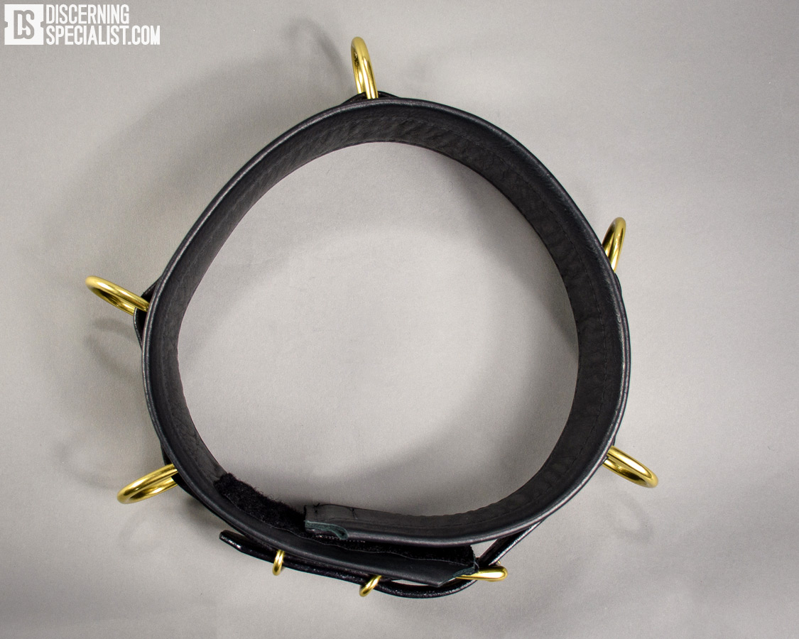 The current hardware layout is 5 D-rings which offer great attachment options. This way one can dial in if they want arms attached to the side a little more forward or a little more back, or just connect to the middle front. To make it more prisoner belt style, a bullring can be added that will be big enough to fit handcuffs in and makes for a nice look as well. When wanting to connect things with the wearer having their arms behind their back, the belt can just be rotated 180 degrees to get the center D-ring placement.